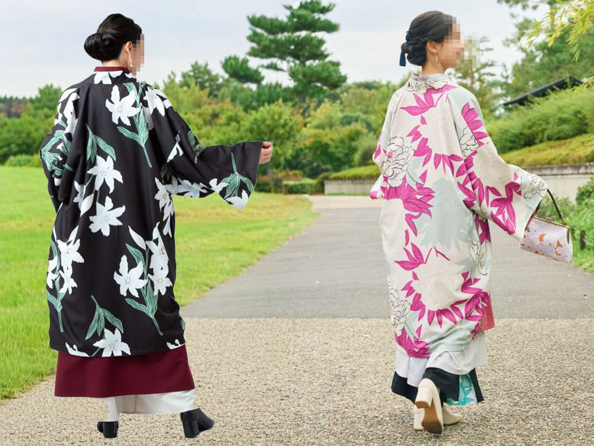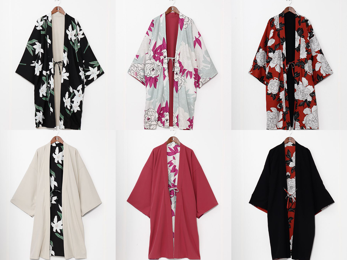 和の花を描いたリバーシブル仕様の着物羽織は、芍薬・牡丹・百合の三柄をモチーフにしています。